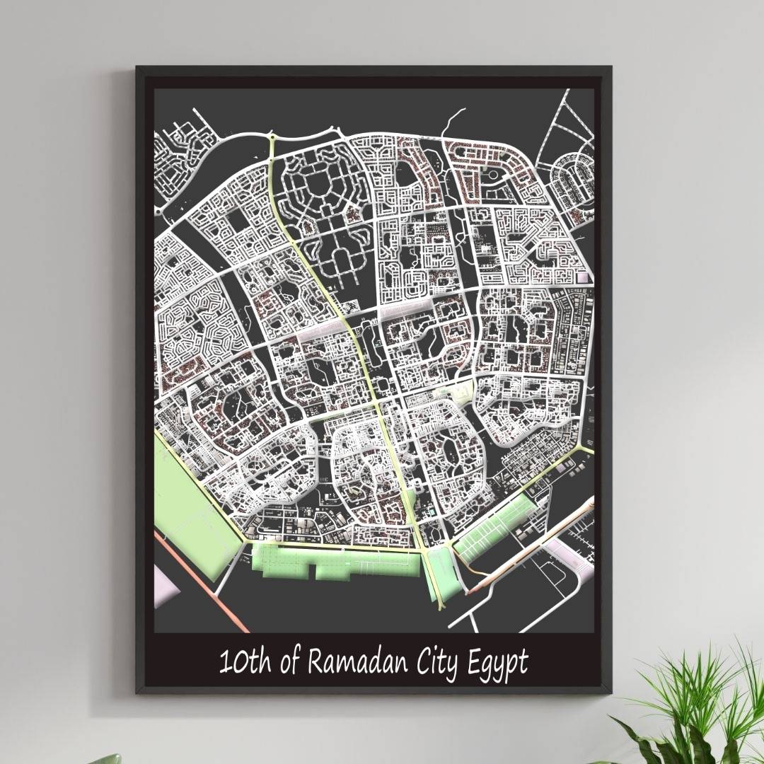 Enhance your space with the beauty of COLOURED ROAD MAP OF 10TH OF RAMADAN CITY, EGYPT BY MAPBAKES, capturing both aesthetics and practicality in one extraordinary map print.