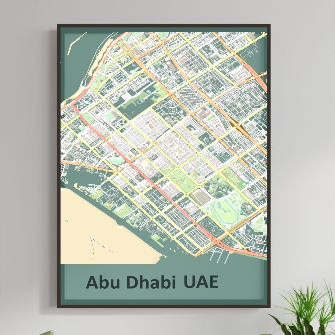 Enhance your space with the beauty of COLOURED ROAD MAP OF ABU DHABI, UAE BY MAPBAKES, capturing both aesthetics and practicality in one extraordinary map print.