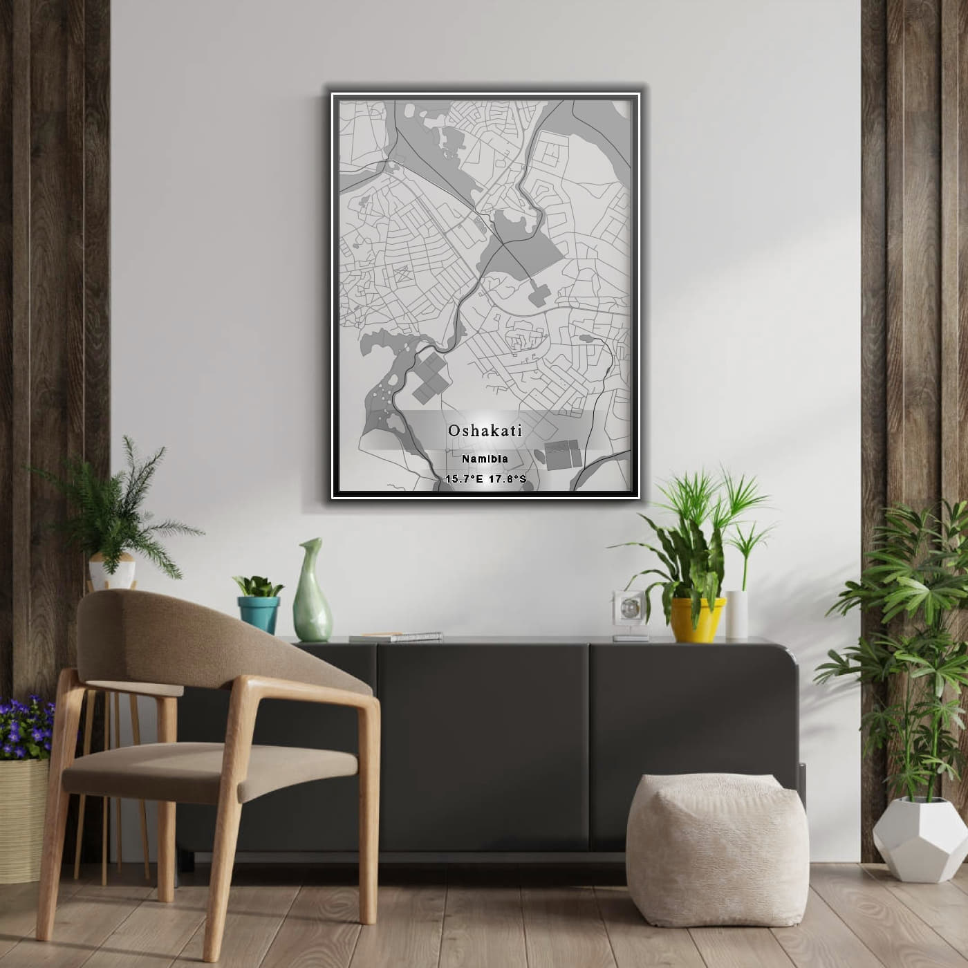 Enhance your space with the beauty of ROAD MAP OF OSHAKATI, NAMIBIA BY MAPBAKES, capturing both aesthetics and practicality in one extraordinary map print.