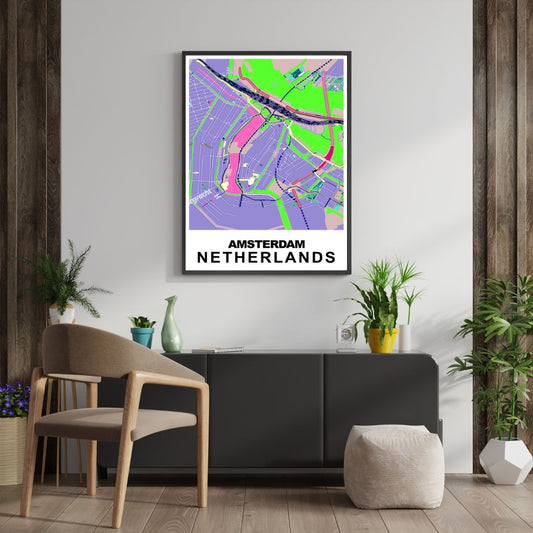 COLOURED ROAD MAP OF AMSTERDAM, NETHERLANDS BY MAPBAKES